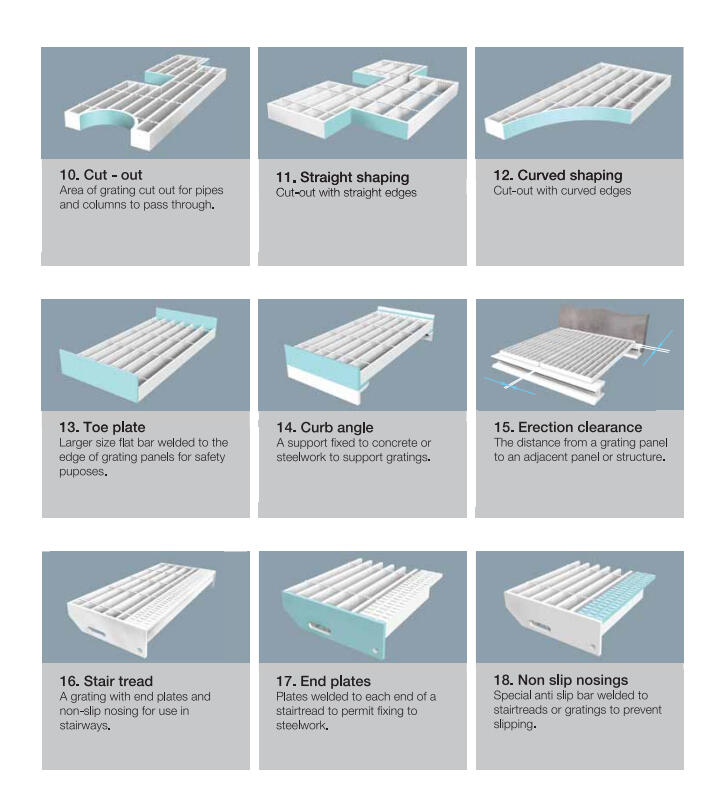 | • Steel Grating: Self-Color and Galvanized Grating: Durable options for various applications. |